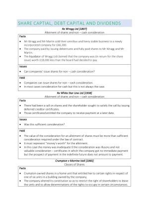 All the cases, concisely summarised into one document and can be taken into exams. Topics covered are: 1. Introduction to Company Law 2. Incorporation and its effects 3. Types of Corporations 4. The constitution and Replaceable Rules 5. Share Capital, dividends and debt capital 6. Corporate Contracting 8. Director's Duties 9. Member Remedies 10. Corporate Mortality