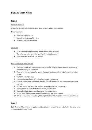BUS130 Full exam notes include: Financial Decisions Valuation Basis for financial management Simple Interest Compound Interest Nominal and effective interest rates Annuity Perpetuity Ordinary annuity Interest rate changes Annuity due Deferred annuity Uneven income stream General annuity Principle and interest loans Intrinsic value Value Bond valuation Preference Share Valuation Dividend Valuation No current dividends Alternative approach Rate of return (yield) Descriptive statistics Inferential statistics Process for examining data (DCOVA) Sample Types Random sample Systematic sample Stratified sample Cluster sample Nonprobability sampling Data Sources Measures of central tendency Measures of variation Distribution shape Interquartile Range Five number summary Basic Probability Normal distribution Covariance (cov(X,Y)) Coefficient of correlation (r) Regression analysis Coefficient of determination Assumptions of regression () Residual analysis Measuring autocorrelation: Durbin-Watson statistic Important Facts about finance Transaction Costs Asymmetric information (insufficient info about other party) Lemons problem - adverse selection influencing financial structure Lemons problem in securities market Tools to help solve adverse selection problems Principal-agent problem Tools to solve principal-agent problem Moral hazard influence on financial structure in debt markets Tools to solve moral hazard in debt contracts Asymmetric information in transition and developing countries Credit markets and adverse selection Moral hazard in credit markets (use the fair rate of interest of the least risky project) Venture capital firms