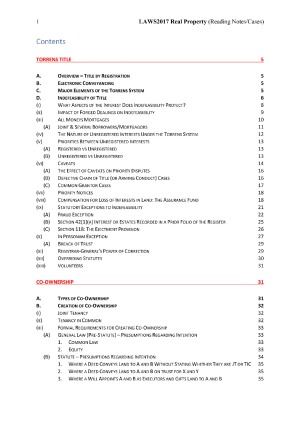 Covers the entire course and provides useful case and legislation summaries that are especially helpful for exam preparation. Topics covered include: - Torrens Title Overview - Indefeasibility of Title - Unregistered Interests in the Torrens System - Priority Disputes (especially useful for the mid-semester exam), including the effect of caveats, unregistered interests, priority notices and the assurance fund - Co-Ownership (Joint Tenancies and Tenancies in Common, Formal Requirements and Rights Between Co-Owners) - Easments & Profits A Prendre - Covenants - Leases and Licences - Mortgages (including Mortgagee's Powers of Sale and Priorities & Tacking) My notes are colour-coded as follows: YELLOW = Cases GREEN = Legislation