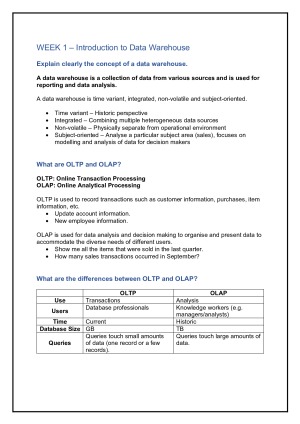 Data Warehousing Notes Covers all topics - Introduction to Data Warehouse - Data Cube and Dimension Modelling - OLAP and Logical DW Design - Practical Concerns of Dimensional Modelling - Data Reduction - Extraction Transform and Load - Data Cube Computation - Mining Frequent Patterns - Decision Tree Induction - Classification - Advanced Methods - Cluster Analysis - Partitioning Methods - Cluster Analysis - Density-Based