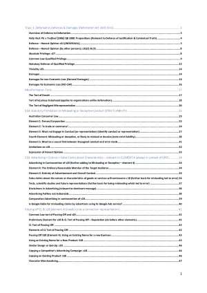 Covers all examinable topics for 2019, this includes: - Defamation Defences & Damages - Misinformation Torts - S18 Elements and Other Relevant Representations - Remedies for Contravention of S18 - Prohibitions in Part 3-1 of the ACL (+additional remedies) - Liability of Manufacturers - Recovery in Negligence for Pure Economic Loss - Other Torts Protecting Economic Interest These notes have been summarised only to include what is relevant to the unit, and assisted me to achieve an overall HD (86) in the Unit.