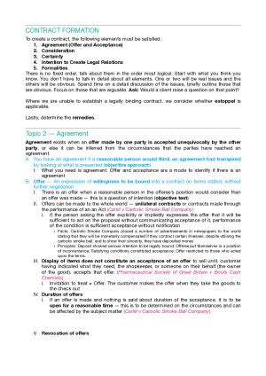 Comprehensive, easy to follow Contracts notes in a scaffold format. These notes are indexed and organised by topic, covering ALL topics, key cases and legislation. These notes help you structure the order of cases and shows you how one case builds on top of another, to create the nuanced web of contract law. Want to save time? Have a case which you don’t really understand? Save yourself from having to read many pages of judgements and re-watching lectures. Get all the key information that you need for cases just on these notes. ✓ Succinct ✓ Comprehensive ✓ Colour-coded for easy reading Get these notes now and help yourself in law school :) TOPICS COVERED Topic 2 — Agreement Topic 3 — Certainty Topic 4 — Consideration Topic 5 — Intention to Create Legal Relations Topic 6 — Formalities Topic 7 — Estoppel Topic 8 — Terms Topic 9 — Construction Topic 10 — Exclusion Clauses and Privity Topic 11 — Discharge by Performance and Agreement Topic 12 — Discharge/Termination for Breach and Repudiation Topic 13 — Discharge by Frustration and the Process of Termination