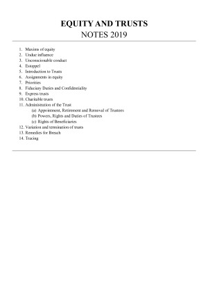 These notes provide an easy, follow along guide to excelling at equity and trusts. You can use these notes as a last minute exam print off, or use them to add to and make your personal notes perfect. Topics covered include: 1. Maxims of equity 2. Undue influence 3. Unconscionable conduct 4. Estoppel 5. Introduction to Trusts 6. Assignments in equity 7. Priorities 8. Fiduciary Duties and Confidentiality 9. Express trusts 10. Charitable trusts 11. Administration of the Trust (a) Appointment, Retirement and Removal of Trustees (b) Powers, Rights and Duties of Trustees (c) Rights of Beneficiaries 12. Variation and termination of trusts 13. Remedies for Breach 14. Tracing