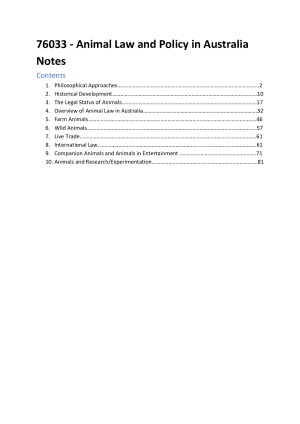 These notes cover the 4 day intensive block topics. The topics covered are: - Philosophical Approaches - Historical Development - The Legal Status of Animals - Overview of Animal Law in Australia - Farm Animals - Wild Animals - Live Trade and International Law - Companion Animals and Animals in Entertainment - Animals and Research/Experimentation My notes were compiled from textbook readings, lecture slides and case law materials. I have also written summary readings that answers the online discussion questions! These notes are helpful for: *Case Note *CP - all cases covered from readings. *Essay