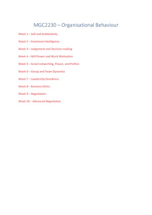 MGC2230 Organisational Behaviour Summary Notes. Organised in Weeks 1-10 (no new content in Weeks 11 and 12). Includes definitions, diagrams and notes from examinable readings. Helped me to achieve a high distinction!