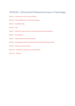 PSY4220 Ethical and Professional Issues in Psychology summary notes. Combination of lecture notes, textbook readings and additional diagrams and images. Organised weeks 1-11 (no new content in week 12), including learning objectives. HD Standard