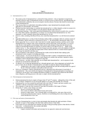 Very detailed and in depth notes for a very dense subject! Topics include: 1. Nature and subjects of international law 2. Sources of international law 3. Relationship between international and municipal law 4. Personality and recognition 5. State jurisdiction and immunities 6. Law of treaties 7. State responsibility 8. Settlement of international disputes 9. Use of force