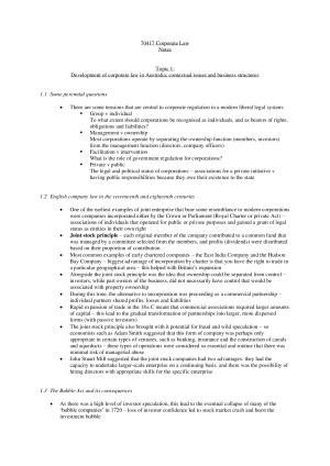 Very detailed and in depth notes for Corporate Law. Contains topic readings and notes from online lectures. Topics: 1. Development of corporate law: contextual issues and business structures 2. Managing companies I: formation, life cycle and corporate liability 3. Managing companies II: internal rules and corporate authority 4. Managing companies III: corporate decision-making 5. ASIC's role in regulation 6. Corporate fundraising 7. Directors duties I: historical development and overview of corporate governance 8. Directors duties II: duty of care, skill and diligence; overview corporate insolvency 9. Directors duties III: good faith and proper purpose; overview finance and control transactions 10. Directors duties IV: managing conflicts of interest 11. Members rights and remedies