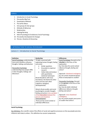 This is a complete summary of all the lectures and examinable readings + tutorials. I also write down anything extra the lecturers say during the lecture, putting emphasis on important content and giving context to the rest of the notes. I obtained a 90 overall in the subject (achieving ~94% in the final exam) using this revision document to study with. Topics include: 1. Introduction to Social Psychology 2. Introduction to Personality (The Big Five) 3. Quantitative Methods 4. The Self & Others 5. Intra-groups & Inter-groups 6. Attitudes & Behaviour 7. Relationships 8. Helping/Harming 9. Moral Psychology & Evolutionary Social Psychology 10. Personality Development & Changes 11. Persons, Situations & Reasoning