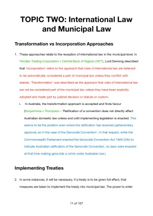 Complete Notes (include seminar notes and textbook readings) and Mind Maps (made by me for the final exam) for each topic in the exam summarising the main ideas. The topics covered are: 1. Sources of International Law 2. International Law and Municipal law 3. International Legal Personality 4. State Jurisdiction and Immunities 5. Law of Treaties 6. State Responsibility 7. Settlement of International Dispute