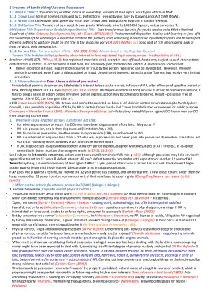 Comprehensive and thorough notes summarising all of the important topics from the lectures and textbook from weeks 1-13. These notes provide a good guide on how to structure your answers to problem questions and outlines all the important cases. These notes were very useful in the exam and helped me achieve a distinction in the subject. The following topics are covered: - System of Landholding/Adverse Possession - Introduction to Equity and Trusts - Trusts - Leases - Creation of Leases - Enforcement of Lease Covenants - Formal Requirements for Creating a Covenant - Remedies - The Rule Against Perpetuities