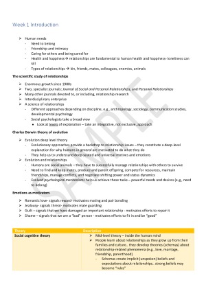 Detailed semester notes, include topics such as: - interpersonal attraction & mate selection - love, lust, attachment and marriage - relationship cognition - feelings and emotions - communication and conflict - friendship and social support - family dynamics Notes includes tables and diagrams