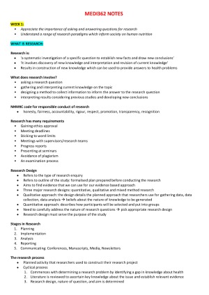These notes are an in depth summary of lecture material, relevant textbook information, relevant papers/ journal articles and extra information given by the lecturer/tutor. Topics covered: • Research ethics • Quantitative and qualitative research studies • Database searching • Reviewing the literature systematically • Research data management and cleaning • Critical appraisal in practice My overall mark was a HD for this subject :)