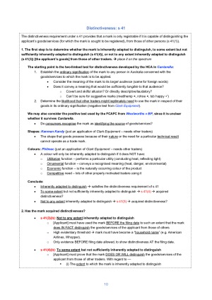 These are the exam notes with which I scored 78 in the subject in Semester 2, 2019. Included are: - Relevant legislative provisions and case law - Steps to follow in hypo with detailed analysis/explanation to aid your understanding - Policy discussion, useful for essay purposes The notes begin with a shorter hypo checklist, then more detailed notes after. Topics covered are those relevant to the final exam: - Justifications for trade mark protection - Registrability - Absolute and relative grounds of opposition - Infringement - Rectification - Trade mark transactions and litigation - Passing off and ACL My notes are typically quite comprehensive but they have served me well. In my first year of the JD, I received a scholarship for academic excellence. I graduated with a high H2A average, did a number of clerkships including one overseas and have a grad position for next year.