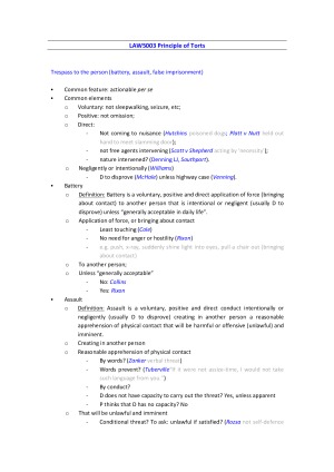 This is a copy of HD (Mark 97) Exam Notes with precise case authorities, which includes the following topics: 1. Trespass to the person (battery, assault, false imprisonment) 2. Trespass to the land 3. Private Nuisance 4. Negligence 5. Vicarious liability Welcome to browse other exam notes that I've uploaded.