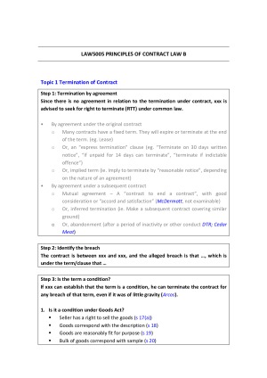 HD Exam Notes with a clear exam structure. There are also simple summaries for those leading cases. The Notes include all the examinable topics: 1. Termination of a Contract 2. Remedies Damages & Limitations Liquidated Damages vs Penalties Specific performance & Injunction Restitution & Action for debt 3. Frustration 4. Common Law Vitiating factors 5. Statutory vitiating factors Statutory Unconscionability Misleading and deceptive conduct Welcome to browse other exam notes that I've uploaded.