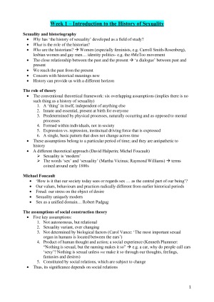 Fully detailed notes for ATS3593: History of Sexuality 1800 - To The Present. They cover all content from weeks 1-12 including notes from all lectures, tutorials, and readings. They also include a helpful list of themes to revise for the exam. These notes led to me obtaining a High Distinction in the unit overall. All you will need to do well in ATS3593! Topics: -Introduction to the History of Sexuality -Love, sexuality and the middle class in the Victorian age -Sexuality, doctors, masculinity and femininity -Sex, class and race in the nineteenth century -Sexual regulation 1840s-1880s -The construction of homosexuality s -Female friendship and desire 1800s-1930s -Sex, eugenics, reproduction and the nation state 1880s-1930s -Marie Stopes and the construction of heterosexuality 1910s 1930s -The Kinsey Survey and sexual liberalism 1940s-1970s -Sexual liberation 1960s-1970s -Exam revision