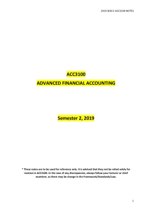 This is my complete set of notes for ACC3100, and includes detailed notes on the following topics (up to date for Sem 2 2019): 1. The Australian Accounting Environment - Conceptual Framework 2. Accounting Theories and Research 3. Measurement 4. Intangible Assets 5. Leases 6. Employee Benefits - Long Service Leave - Share Based Payment 7. Revenue Recognition 8. Extractive Industries 9. Earnings per Share 10. Financial Instruments - Convertible Notes - Foreign Currency Transactions - Hedging Transactions 11. Barker and McGeachin (2015) Article 12. Power (2010) Article
