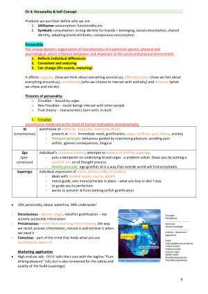 HD comprehensive and super detailed notes include all lecture, tutorial and textbook chapter material necessary for essays and the final :) Easy to read, understand and memorise with supporting graphs, definitions, tables and examples. Everything is also colour coordinated to make memorising easy as this subject is quite content heavy! Topics covered: - Foundations of Consumer Behaviour - Mindful Consumption - Market Segmentation - Needs & Motivation - Personality & Self-Concept - Perception - Learning and Involvement - Attitudes - Social Influences - Cultural Influences - Decision Making