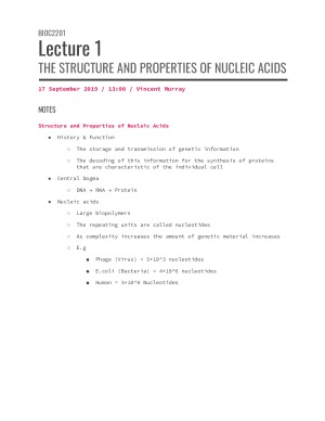 Notes on all assessable topics for the Theory examination of BIOC2201 TOPICS: 1. The structure and properties of nucleic acids 2. DNA replication 3. DNA transcription and translation 4. Protein structure 5. Control of gene expression 6. Recombinant DNA techniques 7. Biotechnology 8. Stem cells 9. Bioinformatics