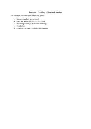 These notes cover the content relevant to the final exam and are based on learning objectives. Topics covered: - renal physiology - respiratory physiology Learning objectives: - be able to explain the relationship between form (structure) and function of different body organs and systems. - be able to define homeostasis and identify regulatory mechanisms by which the body seeks to maintain its internal environment. - be able to outline mechanisms for the control and integration of different body systems. - be able to utilise their understanding of normal function to explain the basis for abnormal function of organ systems covered. - be able to integrate information from concurrent subjects and apply this information to material covered in Veterinary Physiology. - be able to use information presented on domestic species to understand and explain modifications to basic mammalian physiology adopted by different animal species.