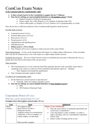 Exam Notes for the whole course. Scored HD on the midsem and D on the problem solving part of the final. Topics include : Midsem: Corporations Power, External Affairs Power, Races Power, Executive Power, Nationhood Power, Appropriations and Spending, Taxation, Inconsistency Final: Defence power, IFPC, S92, S80, S116, S51(xxxi)