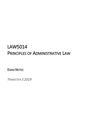 Exam notes created in Trimester 3 2019 for LAW5014 Principles of Administrative Law (Monash JD). These notes are designed to act as a clear and concise checklist. They clearly go through each step that must be considered in an exam, and are filled with clear authorities. These notes have been colour coded for ease of use. These Notes Include: -Introduction to Administrative Law -Jurisdiction to Conduct Judicial Review -Standing -Reasons for Decisions -Grounds for Judicial Review (Ultra Vires) -Grounds for Judicial Review (Procedural Fairness) -Grounds for Judicial Review (Jurisdictional Error) -Remedies -Privative Clauses -Tribunals & Merits Review Note: For the best preview of the notes, view the 'preview' on a non-mobile device. Disclaimer: The accuracy of these notes is not guaranteed