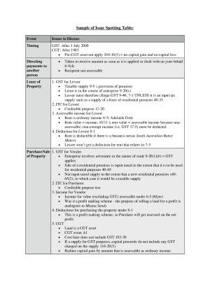 These notes include an issue spotting table (4 pages), written steps for calculating income tax and detailed notes covering cases, legislation and structure of key taxation law topics include GST, income tax, capital gains tax, company tax and superannuation.