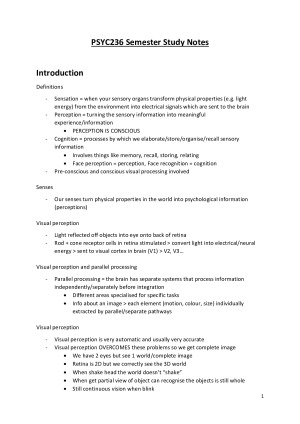 A thorough overview of the entire subject, covering each weekly topic in order (weeks 1 – 13) Combined content and readings from lectures, tutorials, and all required textbook readings. Quite long but all information is significant, very helpful and earned me a HD in the final exam. Organised by topic as listed below. TOPIC LIST - Introduction to perception - Physiology - Size - Depth - Colour - Motion - Object recognition - Face recognition - Introduction to cognition - Modelling cognition - Attention - Change detection - Visual attention - Structure of memory - Autobiographical memory - Language - Cognitive biases and reasoning - Cognition and emotion