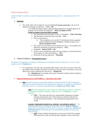 These notes contain: 1. Problem question scaffold (with wording that may be directly inserted into problem questions) 2. Essay Discussion Points (perfect for the essay component of the final exam) 3. Case-law fact summaries (quick snapshots of case law for reference). The topics covered in these notes include: A. Intro; Distribution of Power; Interpretation & External Affairs Power B. Inconsistency (s 109) C. Interpretation; Characterisation; Incidental Power; Severance D. Corporations Power (s 51(xx)) E. Freedom of Interstate Trade F. Taxation & Grants G. Defence Power H Implied Freedom of Political Communication I. Intergovernmental Immunities