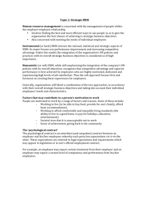 These notes are concise, easy to read, well set-out, and include all the key content you will be tested on in this unit. They have been constructed using lecture materials and the prescribed textbook (Yes, I did all the readings - so you don't have to). I have made sure they aren't too long so as to ensure you can easily find everything when revising. This subject is deceivingly difficult (it is very content-heavy for a level 2 HR unit). However - fear not. Simply learn the key concepts in these notes and rest assured, you will do well in the final exam. TOPICS INCLUDED: 1. Strategic HRM 2. HR Planning 3. Job Design 4. Recruitment and Selection 5. HR Development 6. Performance Management and Termination Laws 7. Reward Management 8. Industrial Relations 9. Diversity Management 10. Occupational Health and Safety 11. Evaluating