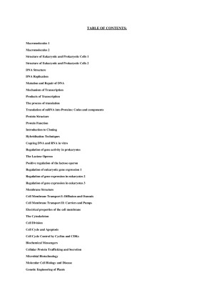 Notes from each of the lectures. Topics included: Macromolecules 1 Macromolecules 2 Structure of Eukaryotic and Prokaryotic Cells 1 Structure of Eukaryotic and Prokaryotic Cells 2 DNA Structure DNA Replication Mutation and Repair of DNA Mechanism of Transcription Products of Transcription The process of translation Translation of mRNA into Proteins: Codes and components Protein Structure Protein Function Introduction to Cloning Hybridisation Techniques Copying DNA and RNA in vitro Regulation of gene activity in prokaryotes The Lactose Operon Positive regulation of the lactose operon Regulation of eukaryotic gene expression 1 Regulation of gene expression in eukaryotes 2 Regulation of gene expression in eukaryotes 3 Membrane Structure Cell Membrane Transport I: Diffusion and Osmosis Cell Membrane Transport II: Carriers and Pumps Electrical properties of the cell membrane The Cytoskeleton Cell Division Cell Cycle and Apoptosis Cell Cycle Control by Cyclins and CDKs Biochemical Messengers Cellular Protein Trafficking and Secretion Microbial Biotechnology Molecular Cell Biology and Disease Genetic Engineering of Plants