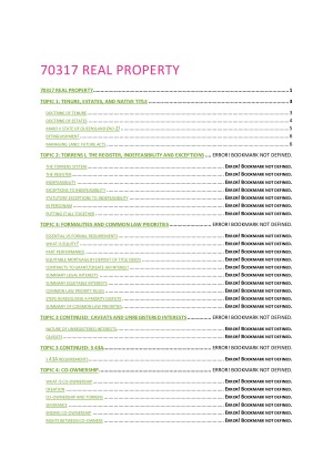 These extensive notes include information taken from seminars, various textbooks, authoritative cases, prescribed readings and further online research compiled into an easily read format. They contain relevant theoretical content, supported by vital, authoritative cases and examples to further your grasp of various content. I consistently achieved Ds and HDs throughout the semester with these notes. These notes can aid you to easily achieve your desired mark - with 115 thoroughly compiled pages, no topic is ignored! Topics included: -Tenures and Estates and Native Title. -Co-ownership. -Torrens Title and the concept of indefeasibility. -Priorities between unregistered competing interests under Torrens Title. -Mortgages. -Formalities. -Easements. -Covenants. -Leases.