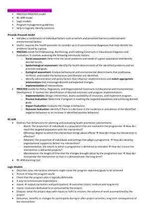 These notes are an in depth summary of lecture material, relevant textbook information, relevant papers/ journal articles and extra information given by the lecturer/tutor. Topics covered: • The Food System • Nutrition Promotion • Public Health Nutrition • Health promotion • Nutrition Promotion: Implementation of Interventions • Does Australia need a sugar tax? • Nutrition Promotion: Program Evaluation • Social Economic Determinants of Health • Food Security in Indigenous Communities • Childhood Obesity • UN Sustainable Development Goals • Food security, food sovereignty and food systems: a new paradigm required to address SDGS • Food Regulation • Australian Dietary Guidelines • Nutrition Monitoring and Surveillance • Advocacy in Public Health Nutrition • How to write a Government Submission • How the Government can support healthy food preferences My overall mark was a HD (85) for this subject :)