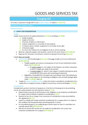 These notes have everything you need to know for the ever daunting tax exam. Colour coordinated to allow for easy cross-referencing between topics and organised in a clear structure to ensure you cover all relevant elements, with references to the textbook where helpful. Also includes my very own version of Barkoczy's infamous one-page diagram, fitting the whole course into a series of boxes (he's right, it is incredibly helpful) and a useful calculation table to put all your figures in during the exam to ensure you don't forget any transactions. These notes helped me get 88% on the final exam, and I know they can help you too :) All topics covered in the course are included: - GST - Income Tax - Income (Ordinary and Statutory) - Deductions (General and Specific) - Capital Assets - Superannuation - Companies and Dividends