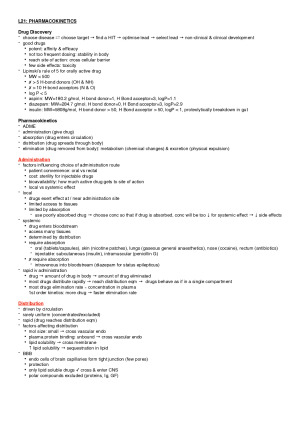 These notes (Part 2) comprise Lectures 18-29 while the remaining notes are available in Part 1 due to size constraint on this site. Notes are clearly organised and written in point forms. Each lecture note is 2-4 pages long yet contains all essential info from lecture slides + explanation stressed by lecturers + relevant diagrams. I solely revised these notes for the MSTs & final exam and managed to get H1 (90%) for this subject :) TOPIC LIST L18: Gene therapy & stem cell based therapy L19: Targeting protein-protein interactions with small molecules L20: Targeting protein-protein interactions with small molecules L21: Pharmacokinetics L22: Pharmacokinetics L23: Pharmacokinetics L24: Pharmacology on a chip L25: Human genetics in drug development L26: Clinical trials L27: Clinical trials L28: Case study III - cannabis L29: Safety pharmacology & drug regulation