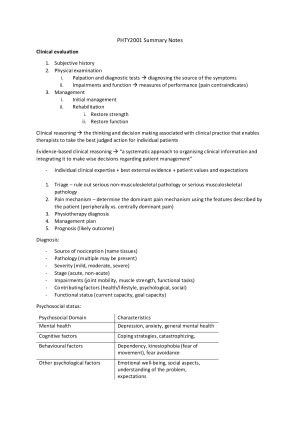 14 pages of concise summary notes of the full semester content - Clinical evaluation - Biomechanics - Rehabilitation pathways - Hamstring injury - Femoroacetabular impingement syndrome - Gluteal tendinopathy - Patellar tendinopathy - Patellofemoral pain - Traumatic knee injury - Hip and knee osteoarthritis - Traumatic ankle injuries - Achilles tendinopathy - Bony stress injuries