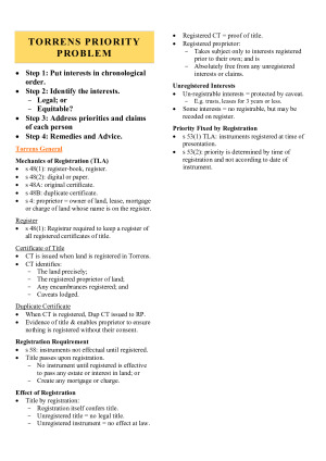 A step-by-step guide to problem-solving for a Property Law exam question. In-depth and extremely useful for any law student. These notes are helpfully organised based on what 'type' of problem is likely to arise during the Property Law A exam. Step-by-step guides on how to solve: - A Torrens title problem with multiple parties arguing over Priority. - A Possession problem. - A Fixtures Problem. - A Leases Problem. - An Encroachments Problem. Topics covered throughout include: - The Torrens title system (registration) - Legal vs Equitable Proprietary interests - Creating a Proprietary interest - Indefeasability - Exceptions to Indefeasability - Caveats - Compensation - Adverse Possession - Finders Keepers - Fixtures - Leases - Encroachments