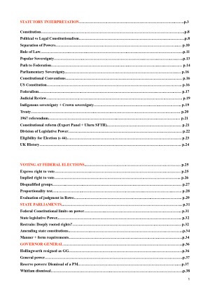 Very comprehensive set of notes that covers the entire course. Main topics: statutory interpretation, the three arms of government and a number of conceptual themes such as the rule of law, seperation of powers etc. To see all the topics refer to the table of contents in the sample notes PDF.