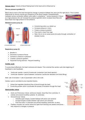 A comprehensive set of notes covering the cardiovascular and renal physiology themes within BMS2031. These notes combine learning material from both the unit and external sources to ensure a thorough, step-by-step understanding of the content and don't contain any irrelevant information. They have been carefully organised with lots of pictures, flow charts, tables and schematics to consisely synthesise content as expected for the assessments in the unit. They have enabled me to achieve a HD on the midsemester test (91%) as well as the final exam (86). Topics/lectures covered include: Cardiovascular system 1. Overview 2. Excitation of the heart 3. Atrial blood pressure and its control 4. Capillary exchange, venous return and cardiac cycle Renal system 1. Function of the kidney and urine formation 2. The role of kidney in regulating total body water 3. The role of kidney in regulating total body Na+