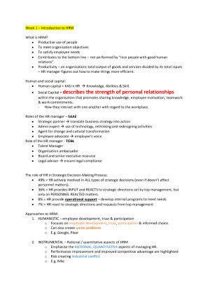 These notes include chapters and lectures that are tested in the mid session exam. The topics that are assessed includes: 1. Introduction to Human Resource Management 2. Job Design 3. Recruitment & Selection 4. Human Resource Planning 5. Performance Appraisal These notes include some easy ways and acronyms that can make it easier for you to remember the content.
