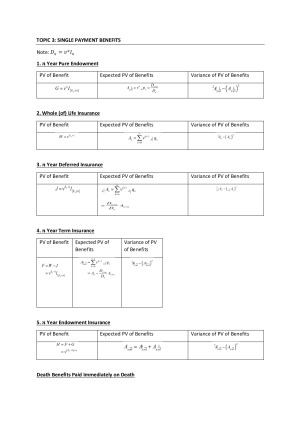 A full set of ACST2055/ACST255 Notes, summarised from lectures, textbook and tutorials. Can be made into reference sheet if font size is shrunk to 6, then print 4 pages per page, double sided. Topic 1: Deterministic Life Tables Topic 2: Stochastic Random Variables Topic 3: Single Payment Benefits Topic 4: Annuities Topic 5: Selection Topic 6: Net Premiums Topic 7: Policy Values Topic 8: Variable Benefits Topic 9: Participating Policies Topic 10: Operating Expenses Topic 11: Analysis of Surplus