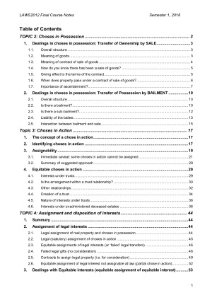 These notes are a compilation of class notes, textbook notes, and case readings. They are comprehensive and step through LAWS2012 in detail, allowing me to achieve Distinction overall. The notes are well-formatted and structured by topic, including: - Key points from lectures - Detailed case outlines with key conclusions - Relevant legislation extracts - Diagrams and flow charts where helpful Topics include: 1. Personal property - choses in possession 2. Personal property - choses in action 3. Assignment and disposition of interests 4. Priority regimes 5. Commercial dealings as security interests over property