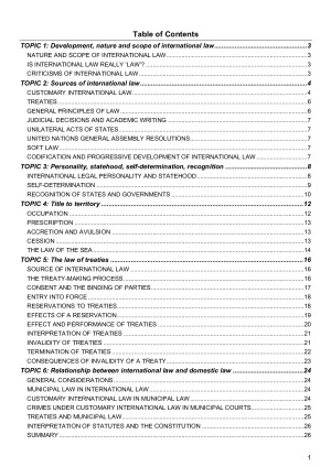 These notes are a concise and summarised compilation of class notes, textbook notes, and case readings. They are comprehensive and step through LAWS1023 in detail, allowing me to achieve Distinction overall. The notes are well-formatted and structured by topic, including: - Key points from lectures (following the UOS outline) - Relevant case and legislation extracts - Diagrams and flow charts where helpful Topics include: 1. Development, nature and scope of international law 2. Sources of international law 3. Personality, statehood, self-determination, recognition 4. Title to territory 5. The law of treaties 6. Relationship between international law and domestic law 7. State jurisdiction 8. Immunity from jurisdiction: diplomatic immunity 9. Immunity from jurisdiction: state immunity 10. The law of state responsibility 11. The treatment of aliens 12. The law on the use of force 13. Settlement of disputes