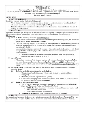 Complete and concise set of exam ready scaffolds for all offences and defences as well as case notes at the end. Scaffolds Covered: - Murder - Manslaughter - Assault - Sexual Offences - Larceny - Complicity - Extreme Provocation - Self Defence - Duress + Necessity - Mental Illness - Automatism - Use of Evidence All scaffolds are formatted in order of how you would answer problem questions. There is a general tips section at the front and outline of problem question steps as well as clear distinctions between the defences of self-defence, duress and necessity.