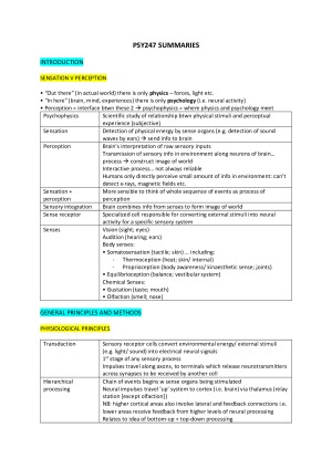 High quality summary notes covering all examinable lecture topics Topics covered: (1) Introduction; General Principles and Methods, (2) Auditory Perception, (3) Body Senses, (4) Body/ Chemical Senses, (5) Light, Eye and Brain, (6) Spatial Vision, (7) Colour Vision, (8) Motion Perception, (9) Depth Perception, (10) Visual Development, (11) Shape and Object Perception; Multi-sensory Processing, (12) Face Perception