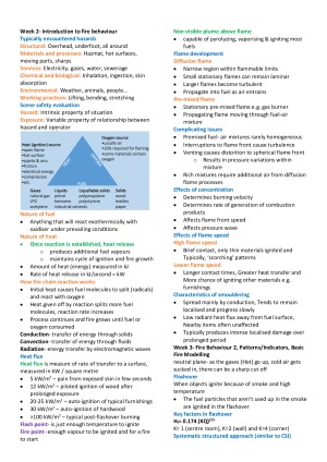 Lecture Notes of the entire semester, very detailed and colourful, with clear headings and diagrams. Topics include: Introduction to fire behaviour Ignition, development and growth of flaming fires Fire Behaviour 2, Patterns/Indicators, Basic Fire Modelling Fire Examination 1: finding the origin; structures, vehicles, special circumstances. Fire Examination 2: fuels and ignition sources; accidental fire causes; arson. Electricity as a cause of fire Part 1- General Wildfire methodology Electricity as a cause of fire Part 2- Appliances, batteries, solar power introduction to explosives Commercial Explosives