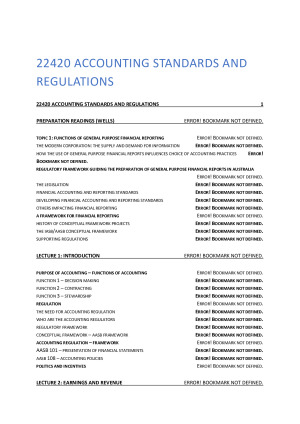 These extensive notes include information taken from lectures, tutorials, various textbooks, prescribed readings and further online research compiled into an easily read format. They contain relevant theoretical content, supported by vital examples to further your grasp of various content. I consistently achieved Ds and HDs throughout the semester with these notes. These notes can aid you to easily achieve your desired mark - with 75 thoroughly compiled pages, no topic is ignored! Topics included: - Preparation readings (Wells) - Introduction - Earnings - Revenue - Assets - Intangible Assets - Natural Resources - Liabilities - Accounting for Leases - Foreign Currency (FX) - Financial Instruments 1 & 2 - Accounting for Tax