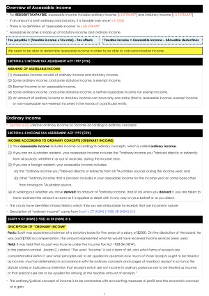 I received a HD in the overall subject. These notes are a compilation of lecture materials, cases, legislation, the study guide, and weekly readings. The notes cover all topics that are assessed in the exam as well as the assignment topic. Throughout the notes, there are summaries and analyses of cases, legislation, examples, and tips for the exam. I have also included very helpful Topic Summaries at the end of the notes which outline key points, themes, rules, and can be used as a guideline for answering exam questions -- which are incredibly helpful for studying for the exam. TOPIC LIST: 1. Assessable Income 2. Capital Gains Tax 3. Deductions 4. Who pays tax and how? 5. FBT and GST 6. Tax planning and administration (tax avoidance)