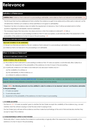 These notes are a compilation of lecture materials, cases, legislation, the study guide and weekly readings. The notes cover all topics that are assessed in the exam as well as the assignment topic. Throughout the notes there are summaries and analyses of cases, legislation, examples and tips for the exam and assignment. I have also included very helpful Answer Guides at the end of the notes which take you through a step by step process and roadmap of answering exam questions -- which are incredibly helpful for studying for the exam as well as during the exam! Topic List: 1. Introduction to Evidence Law 2. Adducing Evidence - Witnesses 3. Adducing Evidence - Documents & other Evidence; Relevance 4. Hearsay 5. Hearsay Exceptions 6. Opinion Evidence 7. Admissions 8. Tendency and Coincidence 9. Credibility 10. Privileges 11. Discretionary and Mandatory Exclusions